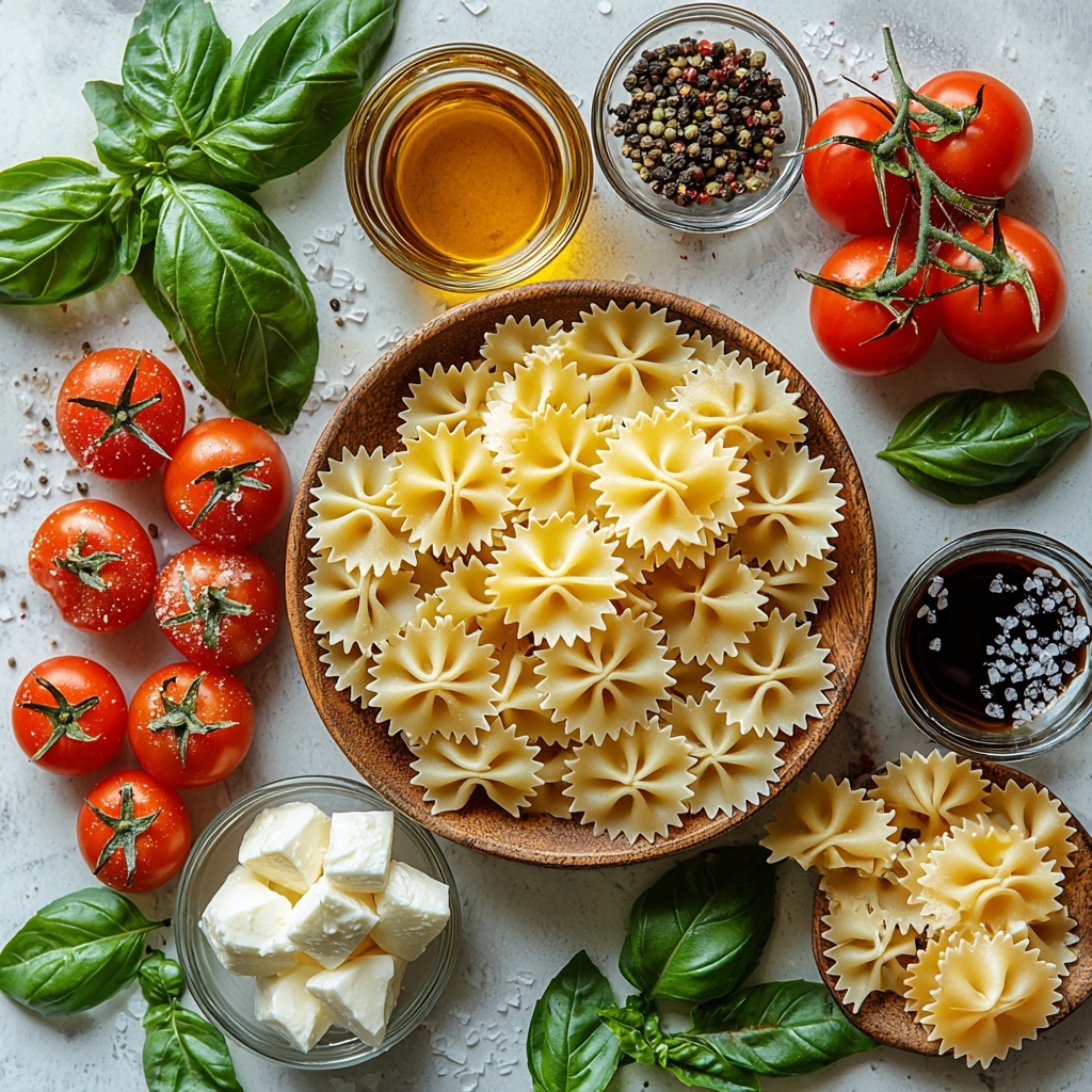 A refreshing and easy-to-make Caprese Pasta Salad combining tender farfalle pasta with juicy cherry tomatoes, creamy mozzarella pearls, and fragrant fresh basil, finished with a drizzle of olive oil and balsamic glaze. Perfect for a light lunch or as a side dish for any meal.