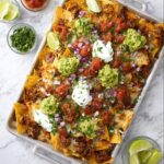 To reheat leftover assembled nachos, place them on a baking sheet and warm in the oven at 350ºF for 5-7 minutes to revive the melted cheese and crisp up the chips. Avoid microwaving to prevent sogginess, and add fresh sour cream, guacamole, and salsa after reheating to refresh the flavors.