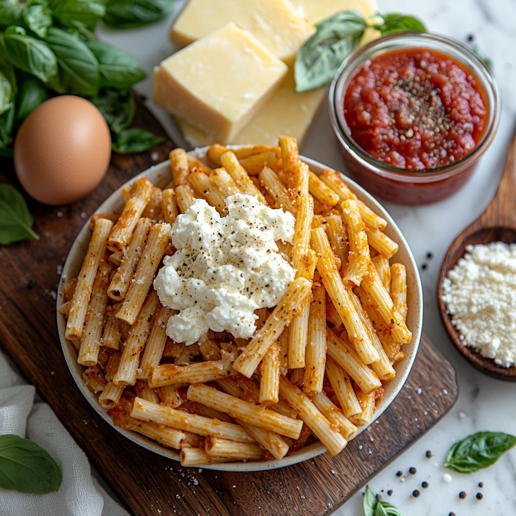 While your meat sauce simmers, mix up the ricotta cheese, egg, garlic powder, salt, and pepper in a bowl. This creamy mixture acts like a luscious layer in your Cheesy Baked Ziti Recipe, providing a soft, slightly tangy contrast to the hearty meat and pasta. The egg helps everything bind together for a satisfying texture that stays intact after baking.
