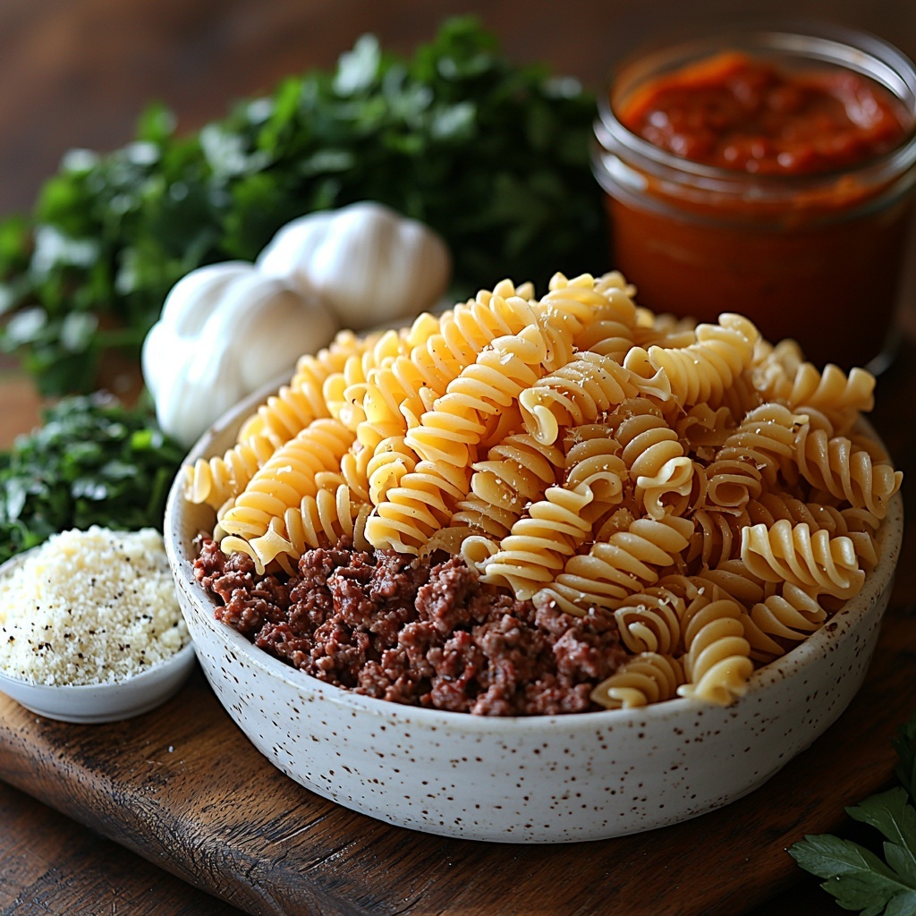 Everything you need for the Cheesy Garlic Twisted Pasta with Cajun Ground Beef Recipe is uncomplicated but downright essential. Each ingredient plays a special role, from the sturdy rotini pasta that holds onto every bit of the creamy sauce to the bold Cajun seasoning giving the beef its signature kick.