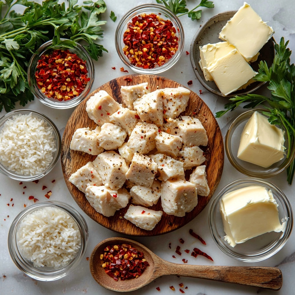 In a separate pan, melt a bit more butter with minced garlic, crushed red pepper, and chopped parsley to develop a vibrant scampi glaze. Add the cooked chicken pieces back to the pan and toss them in the glaze to coat every bite with that irresistible garlicky, buttery sauce. This step infuses the chicken with the classic scampi flavor and a hint of heat that balances beautifully with the creamy rice.