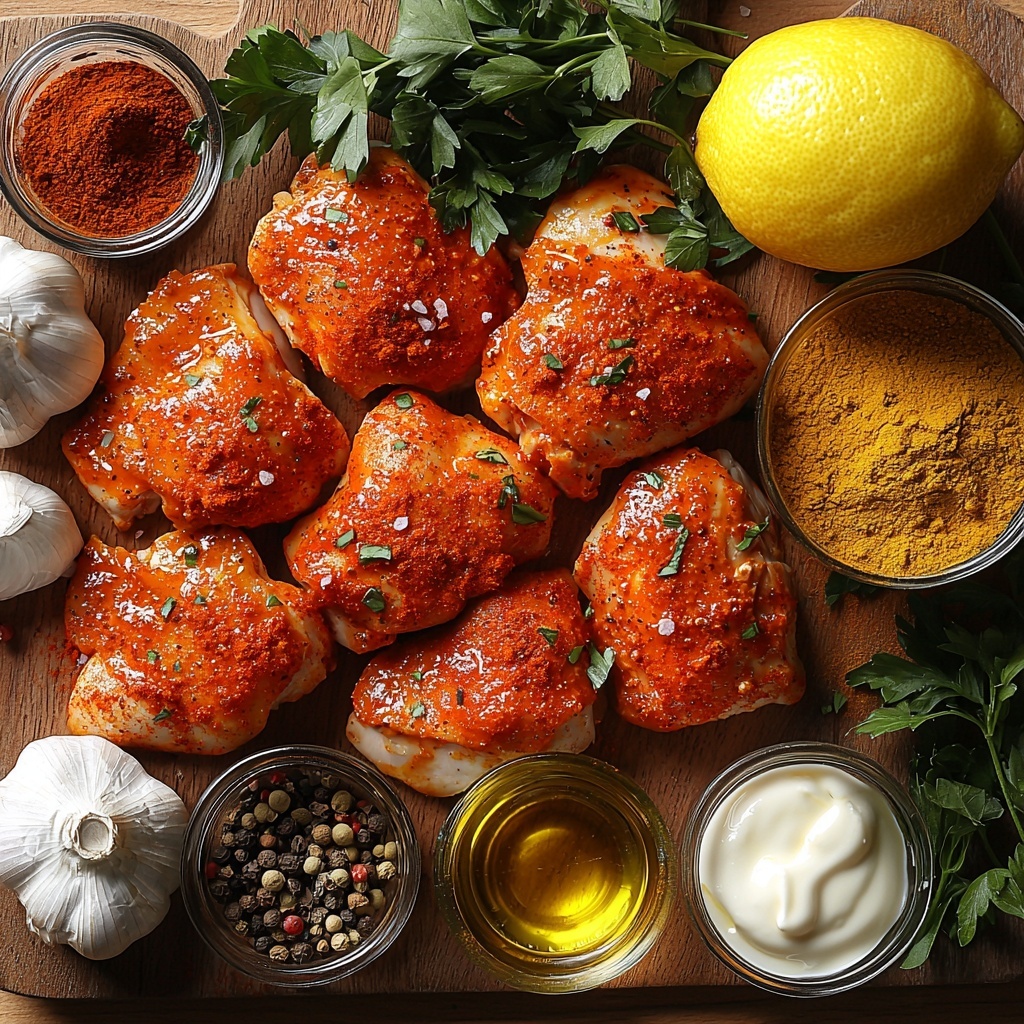 - Marinate the Chicken: In a large bowl, combine olive oil, ground cumin, paprika, turmeric, coriander, cinnamon, minced garlic, lemon juice, salt, and black pepper. Add the chicken thighs or breasts and coat evenly with the marinade. Cover and refrigerate for at least 30 minutes to allow the flavors to develop.