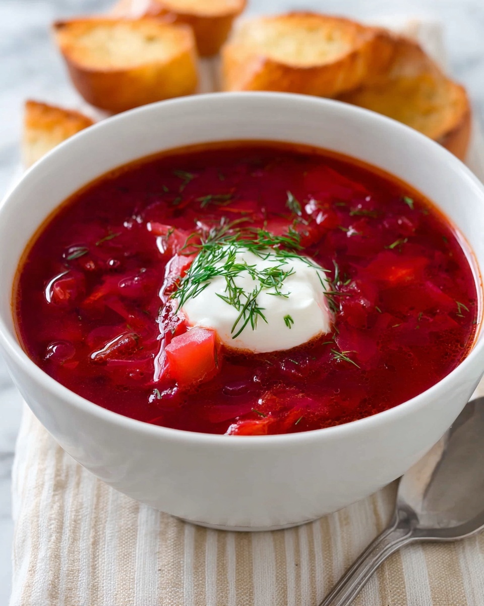 Try serving the borscht in individual bowls with a swirl of sour cream and a sprinkle of fresh dill right before serving. Another fun idea is to ladle it into shot glasses as an appetizer for gatherings—its vivid red hue never fails to impress guests and stimulate appetites.