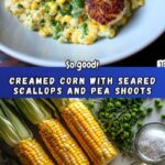 For a dinner party, serve the creamed corn in small ramekins with scallops nestled on top and pea shoots as a delicate crown. Alternatively, plate the corn in a shallow bowl and arrange scallops in a circle around it, garnished with pea shoots and edible flowers for a wow factor.