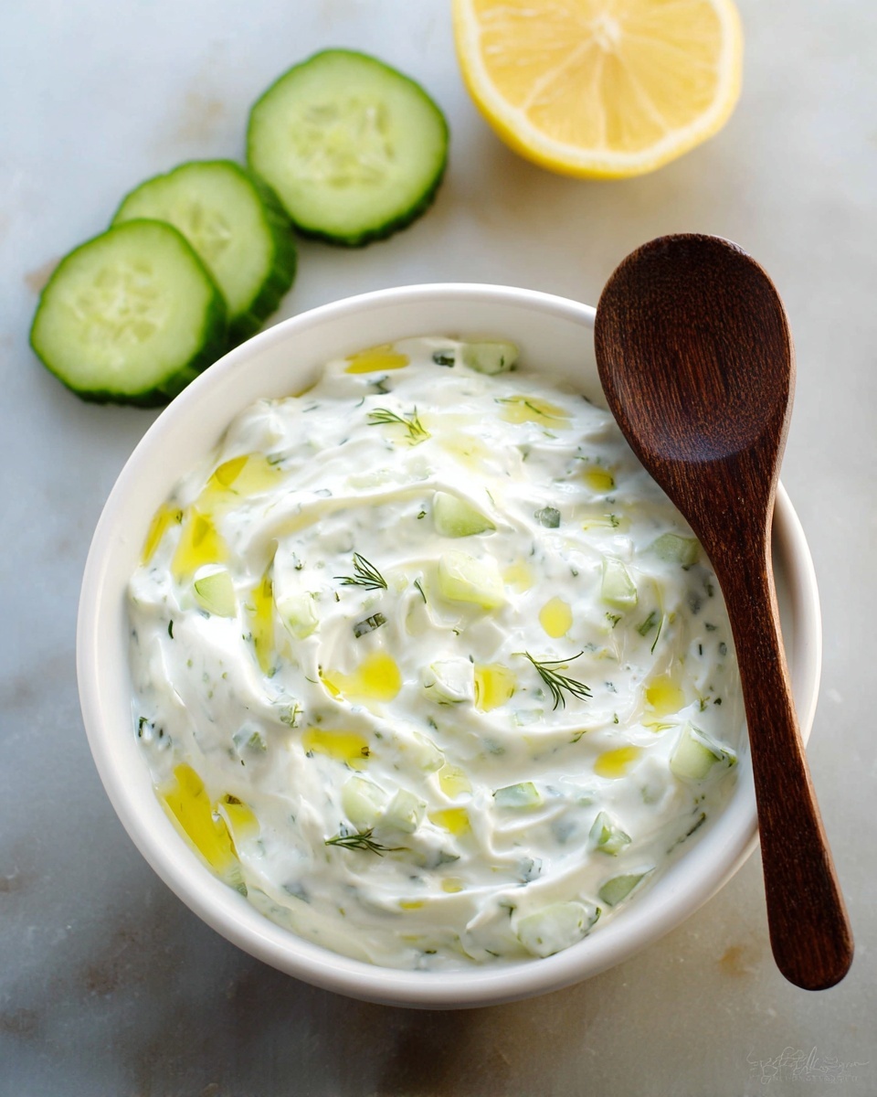 For the best flavor, cover your sauce and refrigerate for at least 30 minutes to allow the flavors to meld beautifully. This resting time helps mellow the garlic and lets the cucumber and dill infuse the yogurt with their fresh aromas. When ready, give it a final stir, drizzle with a little more olive oil if you like, and you’re set!