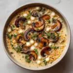 This Creamy Mushroom & Pearl Couscous Soup is a comforting and flavorful dish perfect for a cozy meal. It features sautéed mushrooms and pearl couscous simmered in a savory vegetable broth, enriched with creamy heavy cream and brightened with a splash of lemon juice. Garnished with fresh parsley, this vegetarian soup offers a satisfying blend of textures and flavors.