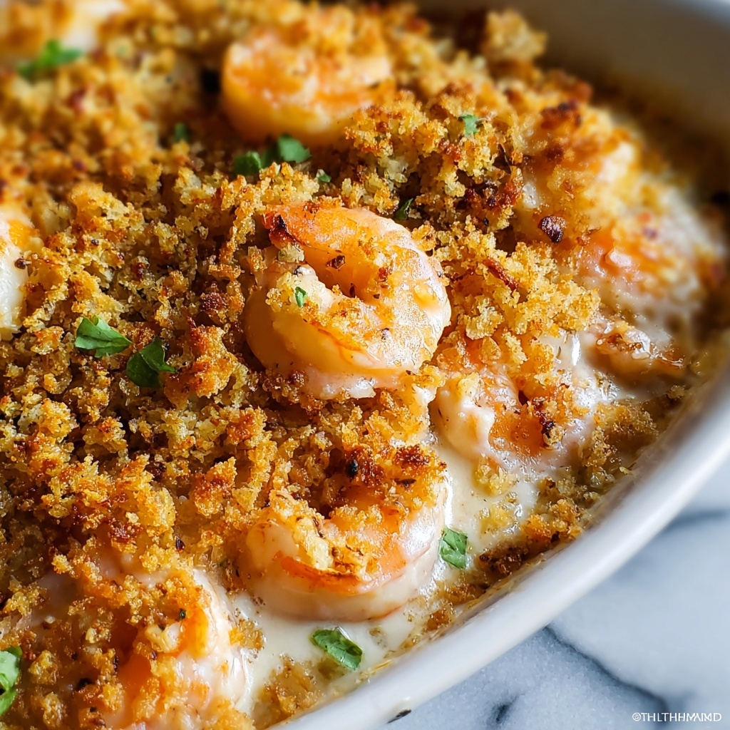 Reheat leftovers in a 350°F (175°C) oven until warmed through and the breadcrumb topping regains some crispness, about 15 minutes. Avoid the microwave if possible to keep the crust crunchy and the shrimp tender.
