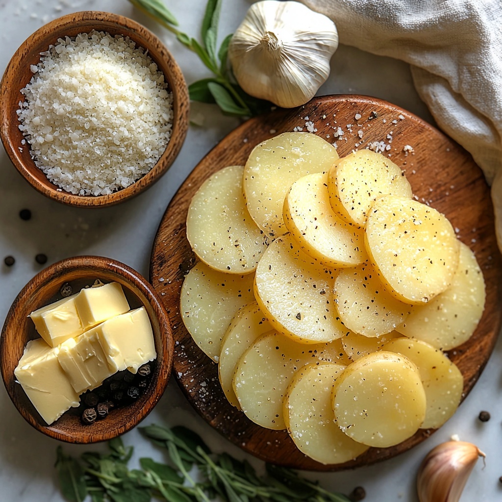 - Slice Potatoes: Using a mandoline slicer or a sharp knife, slice the Yukon Gold potatoes into 1/8-inch thick rounds for even layering and optimal texture.