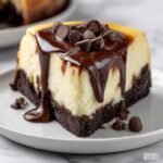 This Fudgy Brownie Bottom Cheesecake combines a rich, chocolaty brownie base with a smooth, creamy cheesecake layer for a decadent dessert experience. The brownie layer is dense and fudgy, baked to perfection, while the cheesecake topping is silky with a hint of vanilla. Finished with chocolate ganache drizzle and semi-sweet chocolate chips, this dessert is perfect for chocolate lovers looking for an indulgent treat.