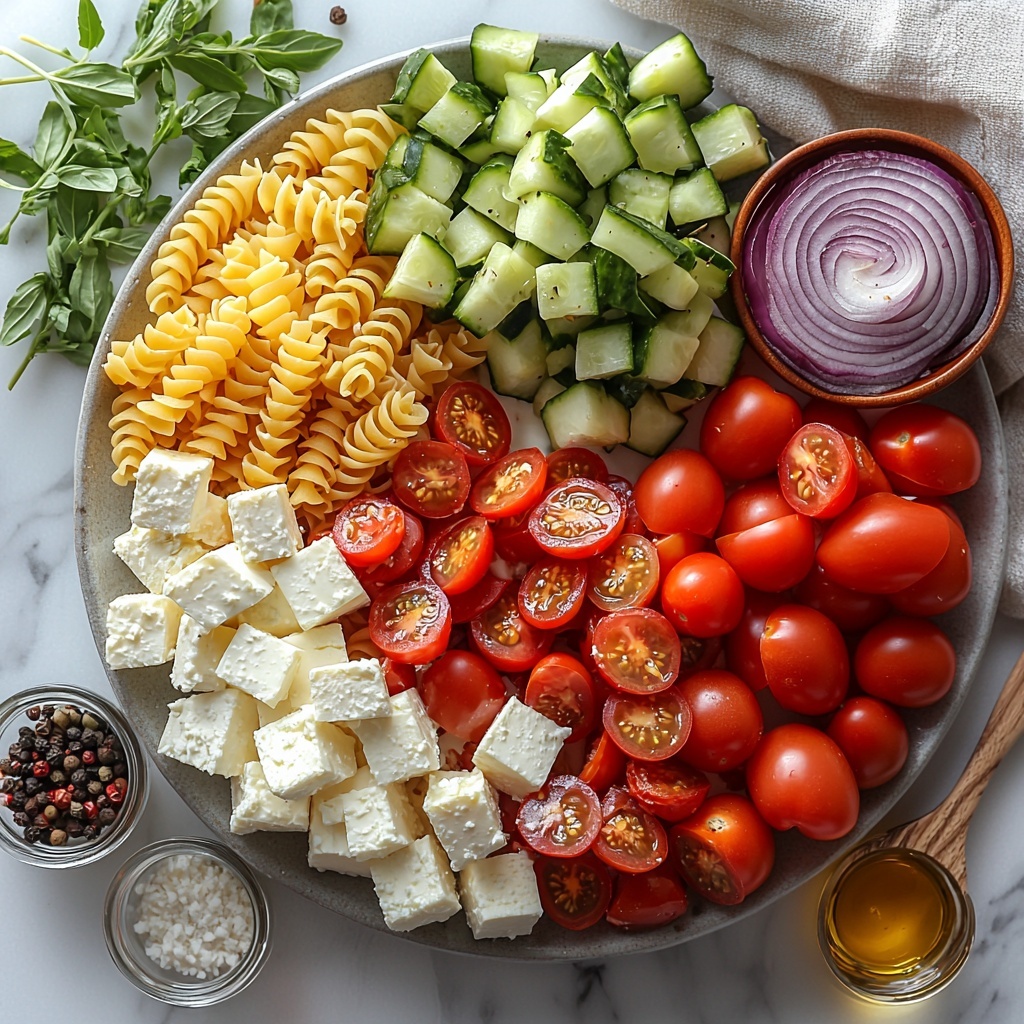 The magic of this Greek Pasta Salad Recipe lies in the simplicity and quality of each ingredient. Every element has a role—whether it’s adding brightness, crunch, creaminess, or that signature Mediterranean flair—so gather them with care to get the best result.