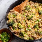 This Ground Turkey Broccoli Cheese Rice Skillet is a comforting and hearty one-pan meal perfect for busy weeknights. Ground turkey is cooked with aromatic onions and garlic, then simmered with rice, broccoli, and flavorful herbs in a savory broth. Topped with a golden, cheesy panko crust under the broiler, this dish offers a delightful combination of textures and flavors in just 40 minutes.