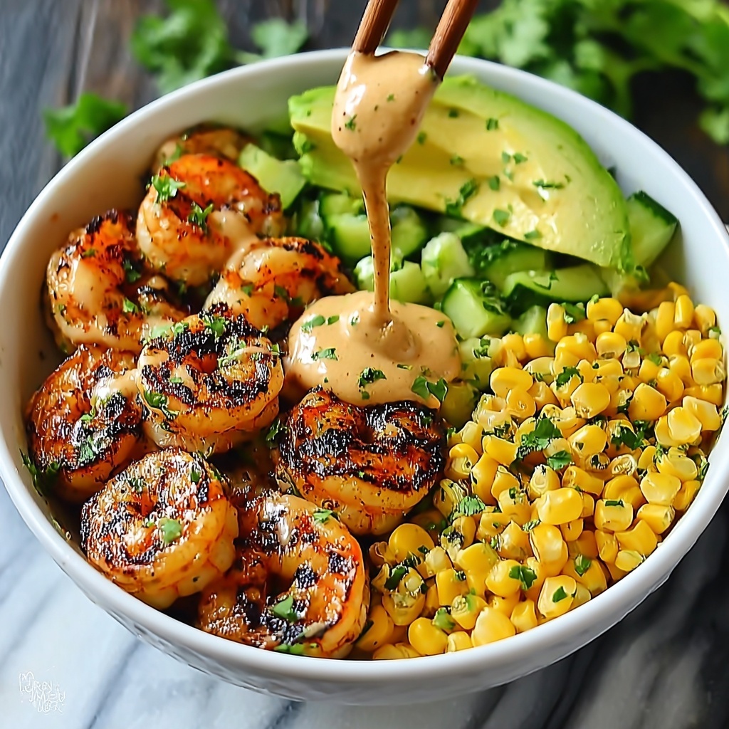 Juicy Grilled Shrimp Bowl with Avocado Corn Salsa & Creamy Sauce Recipe