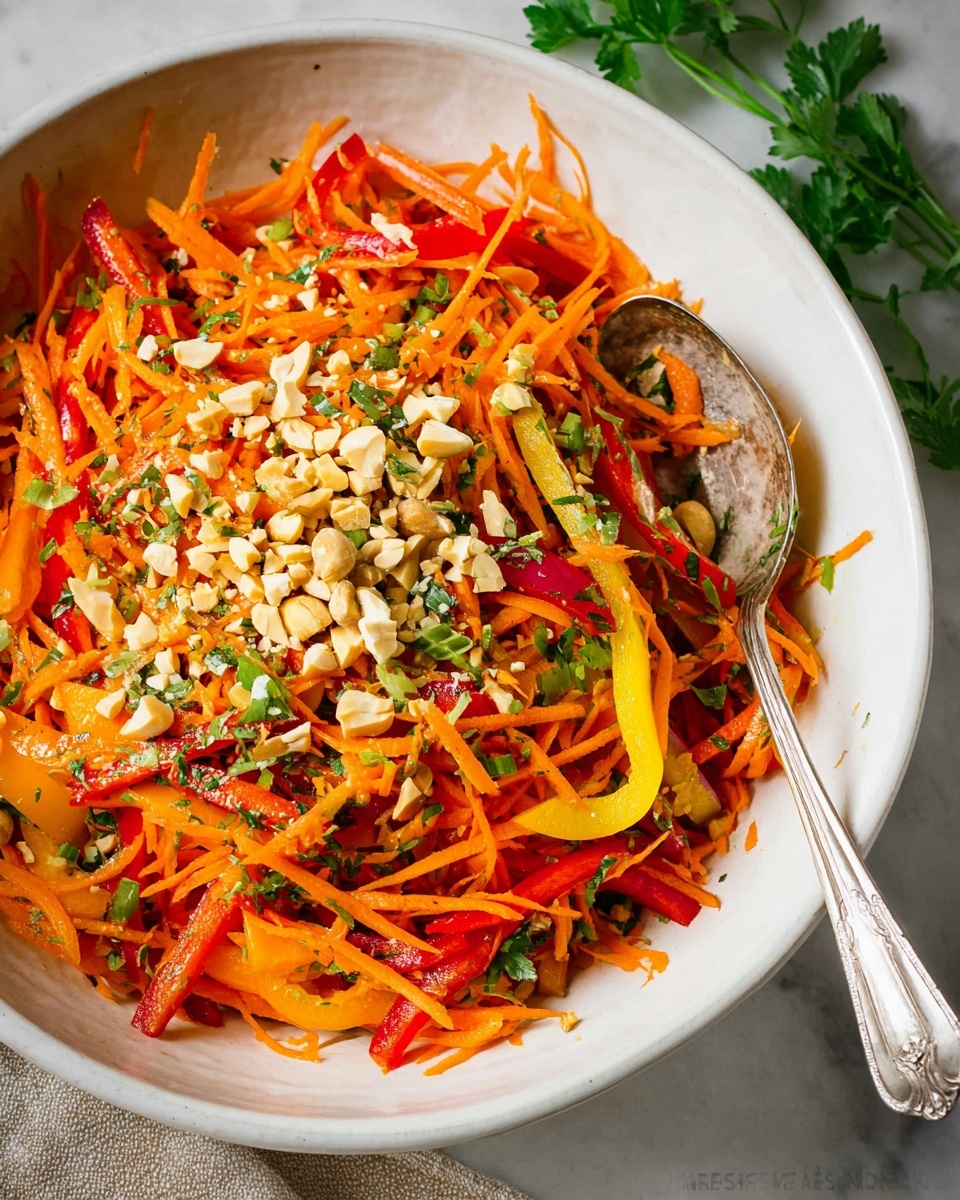 For a fun twist, serve the salad in individual lettuce cups or hollowed-out bell peppers. You can also layer it on rice paper wraps for a fresh, hand-held appetizer. This Korean Carrot Salad with Cashews and Crispy Bell Peppers Recipe is so versatile that it invites playful presentation styles to impress your guests.