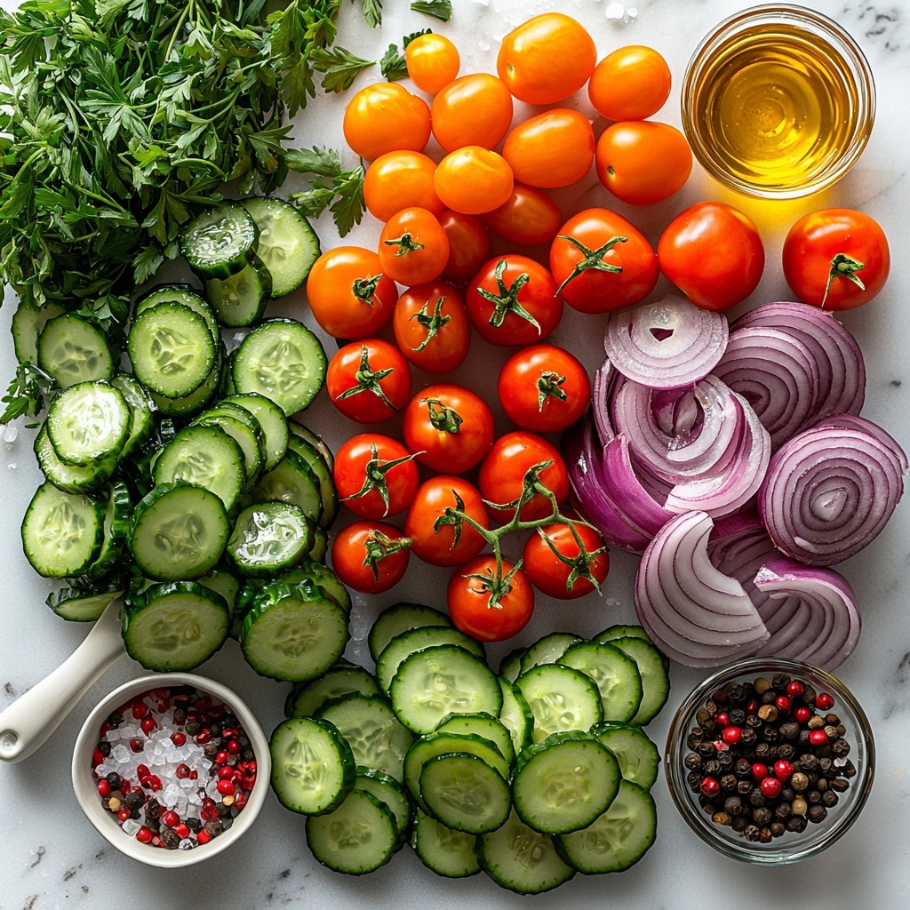 Gathering simple, fresh ingredients is key to letting the natural goodness of this salad shine. Each component plays a crucial role: cucumbers bring a refreshing crunch, onions add a subtle pungency, and tomatoes offer juicy sweetness—all harmonized by a lively marinade.
