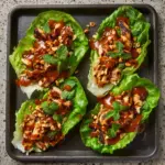 Remove the skillet from heat. Carefully spoon the savory chicken mixture into individual butter lettuce or romaine leaves. These crisp leaves serve as the perfect natural cups to hold every flavorful bite. Don’t forget the final touch—sprinkle chopped peanuts and fresh cilantro on top for that crunch and herbal freshness.