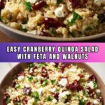 A vibrant and nutritious Quinoa Cranberry Salad featuring fluffy quinoa, tangy dried cranberries, crisp vegetables, crunchy walnuts, and creamy feta, all tossed in a zesty lemon-Dijon dressing. Perfect as a make-ahead meal or refreshing side dish suitable for vegetarians.
