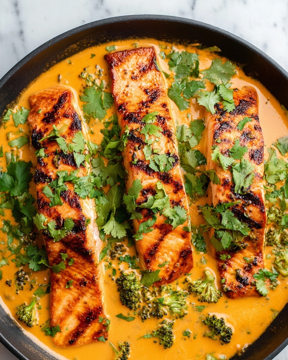 To reheat, warm the curry gently in a saucepan over low heat, stirring occasionally. Adding a splash of coconut milk or water can help loosen the sauce if it has thickened too much. Avoid microwaving aggressively to keep the salmon tender and prevent the sauce from separating.