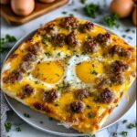 Remove the skillet from heat and immediately stir in the cooked sausage along with the shredded cheddar cheese. The residual warmth will melt the cheese perfectly into the eggs and sausage, creating a heavenly blend of flavors with every bite.