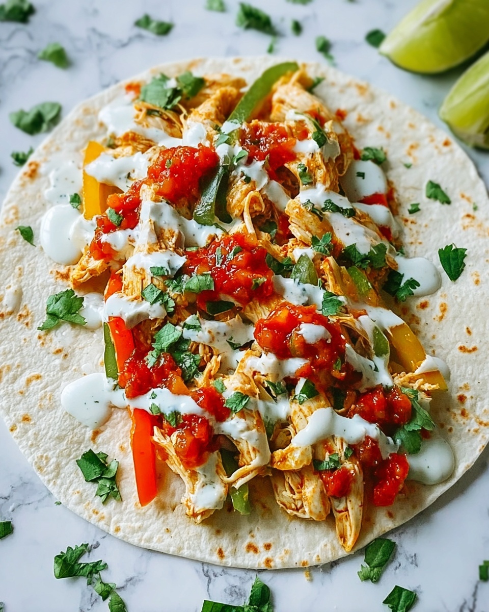 Reheat your leftovers in a skillet over medium heat or in the microwave until warmed through. Adding a splash of water or broth can help keep the chicken moist as it reheats. Then, pile it back into warmed tortillas with your favorite toppings and enjoy a quick, satisfying meal anytime.