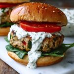 These Sun-Dried Tomato and Feta Spinach Burgers offer a flavorful twist on classic chicken burgers. Infused with sun-dried tomatoes, tangy feta cheese, and nutritious spinach, they are perfectly complemented by a refreshing tzatziki sauce. Quick to prepare and cook in just 25 minutes, these burgers make a delightful, wholesome meal for any occasion.